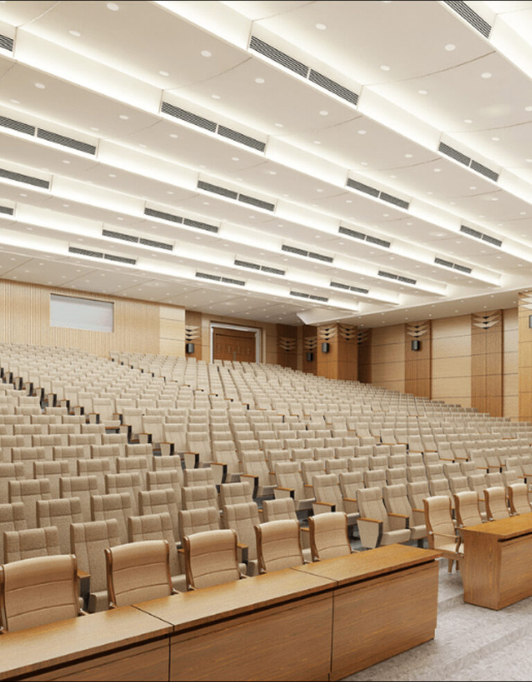 Thiết kế hội trường chuyên nghiệp, tối ưu không gian và công năng sử dụng theo từng mục đích: hội nghị, hội thảo, sự kiện. Đảm bảo đầy đủ các yếu tố quan trọng như sân khấu, âm thanh, ánh sáng và nội thất đồng bộ.